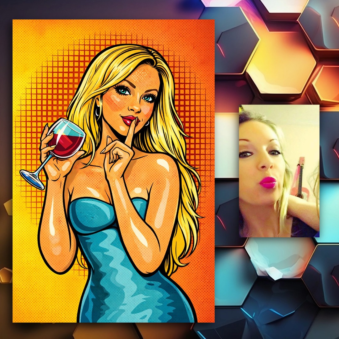 Set against a vibrant halftone backdrop, the composition is bold, glamorous, and undeniably magnetic. The wine glass, the confident posture, the direct gaze — every detail works together to create a scene filled with intrigue and personality.