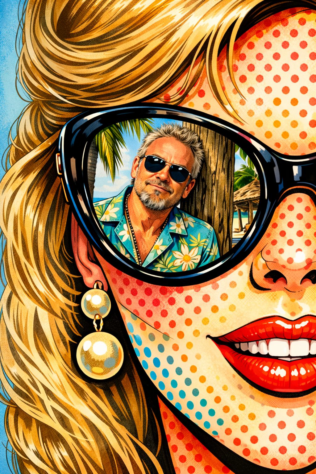 De’Mital’s signature pop-art technique brings this image to life with bold outlines, dramatic shading, and high-contrast color blocking. The foreground features confident style and radiant detail, while the reflection in the lenses reveals a relaxed, charismatic presence set against a tropical backdrop.