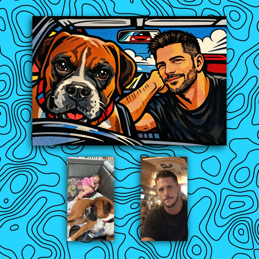 De’Mital’s signature comic-inspired style shines through in every detail. The bold outlines, dramatic shading, and vibrant reds and blues give the piece an energetic pulse. The dog’s expressive eyes and relaxed posture radiate loyalty and trust, while the confident smile of the driver suggests ease, pride, and connection.